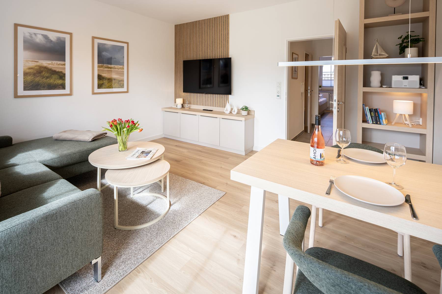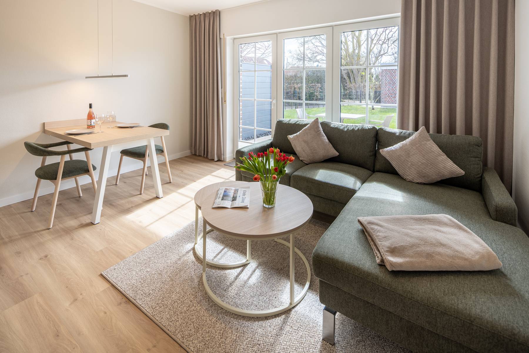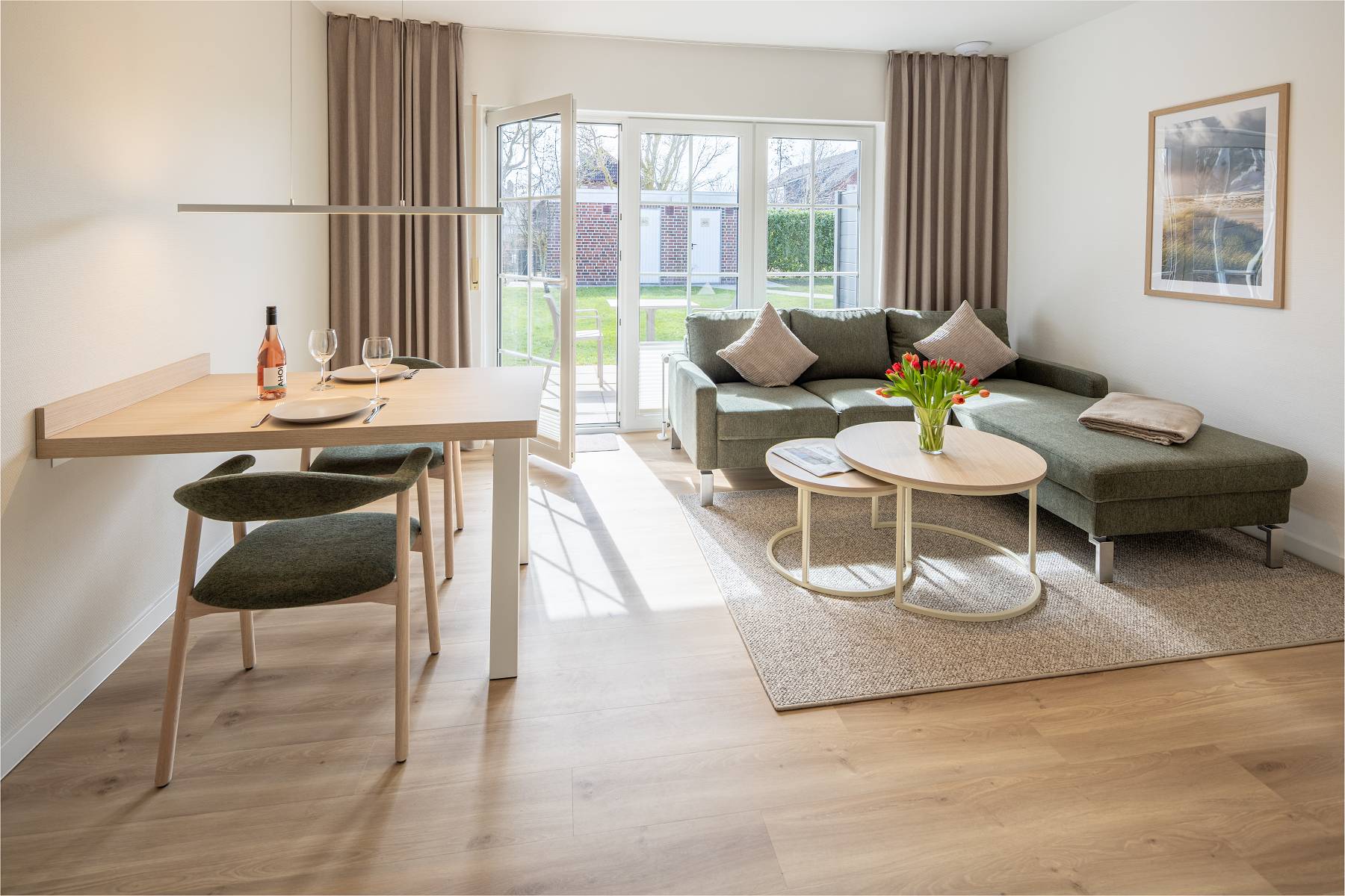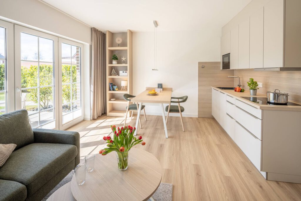 Im Wohnzimmer sorgen bodentiefe Fenster und die große Terrassentür für eine freundliche, helle Atmosphäre. Selbst an norddeutschen Schietwetter-Tagen lässt es sich hier gemütlich entspannen. Die offene Küchenzeile ist funktional ausgestattet mit Kochfeld, Spülmaschine, Kühlschrank, Mikrowelle, Kaffeemaschine, Wasserkocher und den wichtigsten Küchenutensilien – perfekt für Selbstversorger.
