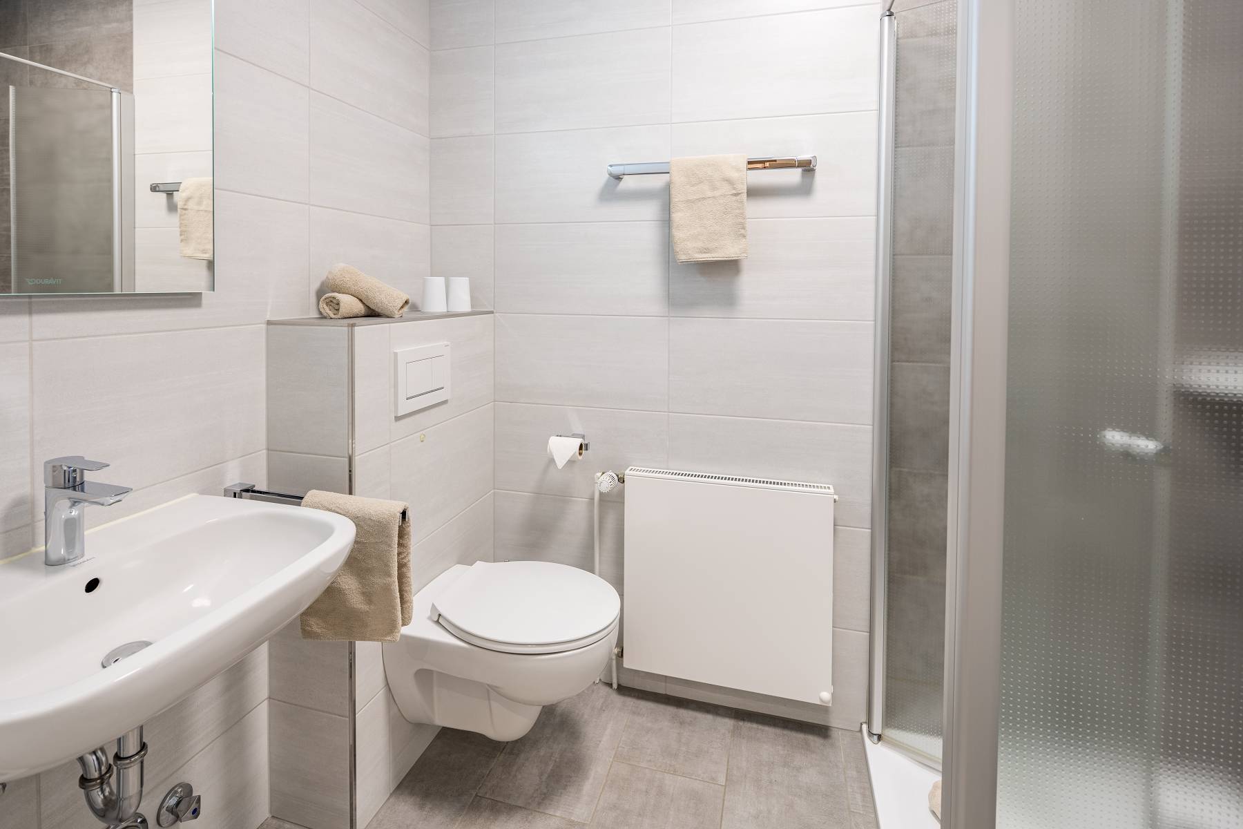 - Badezimmer mit Dusche, WC, Waschbecken und Spiegel