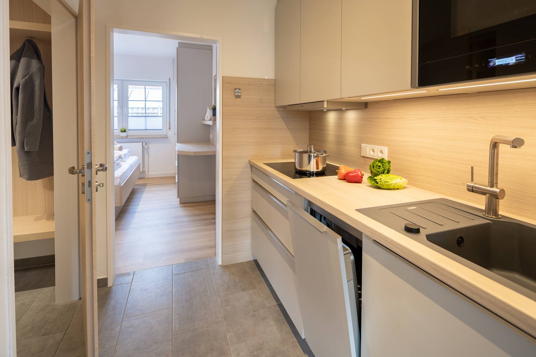 - Küchenzeile mit Induktionskochfeld, Spülmaschine, Mikrowelle, Kühlschrank, Kaffeemaschine, Wasserkocher, Toaster